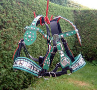 16c in schwarz-grün mit Edelweißbeschlägen und kantengestickten Pferdekopfanhängern
