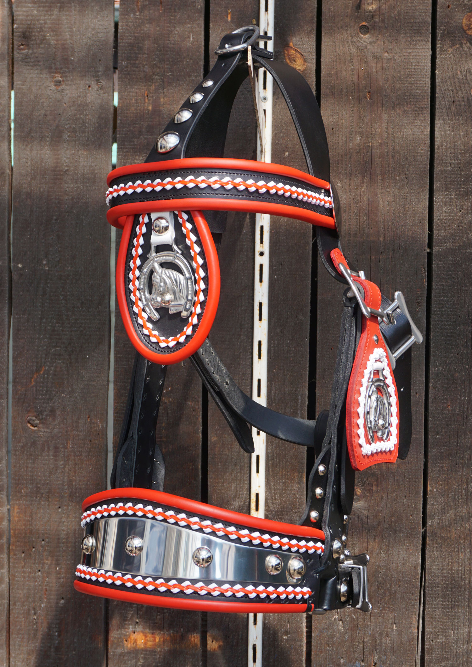 28c mit kantengestickem Stirnband und Stirnspieler sowie mit rotem Leder unterlegtem Nasenbandblech